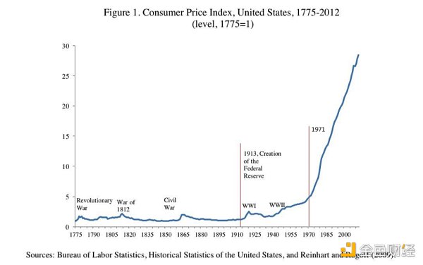 美元没有和稳定资产的供给绑定,所以美国能够随意印刷美元。无论巧合与否,自1971年以来,消费品价格都呈指数增长。