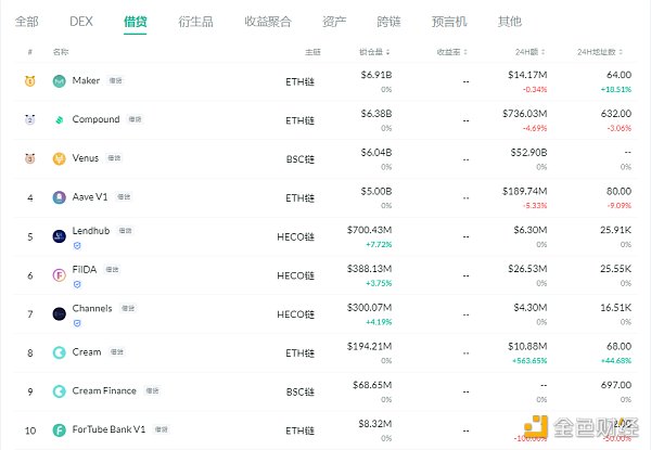 锁仓量排名前十的借贷平台 排名来源:DeFibox