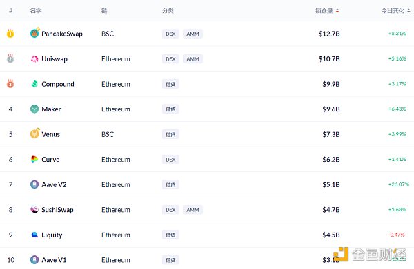 DeFi项目锁定资产前十排名及锁仓量,数据来源:Debank