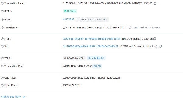 攻击者通过DEGO.Finance: Deployer账户移除流动性获取了269,502个dego代币和378个ETH。