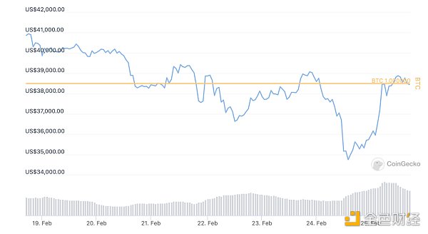 2月24日,根据Coingecko数据,BTC最低跌至34740美元/枚,为2021年7月以来首次跌破35000美元。其他加密货币价格也普遍随之下跌。加密货币整体市值大幅缩水。